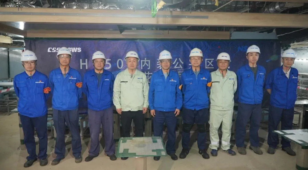 6月18日,第二艘國產(chǎn)大型郵輪H1509船迎來重要節(jié)點(diǎn):公共區(qū)域JA14船員餐廳首塊天花板正式封板開工,標(biāo)志著全船公共區(qū)域天花封板工作全面啟動。公司副總經(jīng)理周琦、總監(jiān)吳曉源、華南建材(深圳)有限公司副總經(jīng)理田亞軍及相關(guān)部門代表共同參加了封板儀式。
